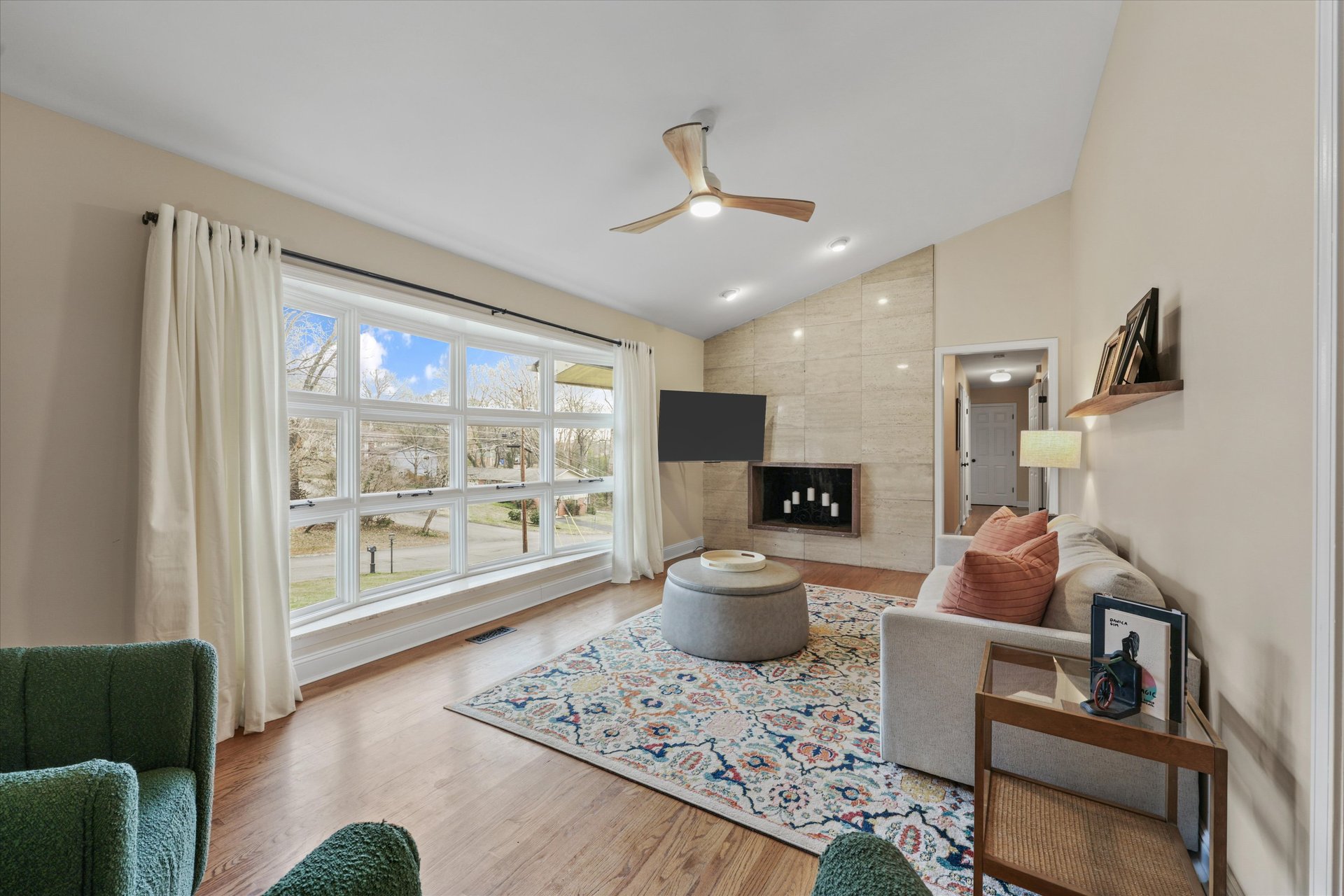 This home offers three bedrooms and two bathrooms, including a primary suite with an ensuite bath for everyday convenience. The main living area features warm hardwood floors, a statement mid-century modern fireplace, and a bright eat-in kitchen filled with natural light.